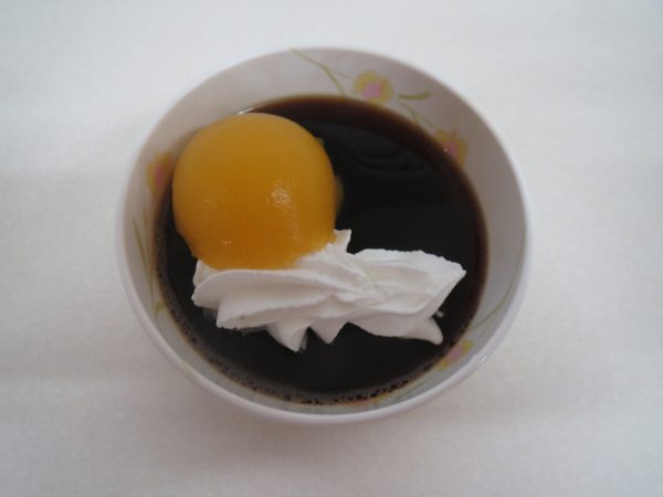 コーヒーゼリーを夜に、黄桃のゼリーを月に、生クリームを雲に見立てました。