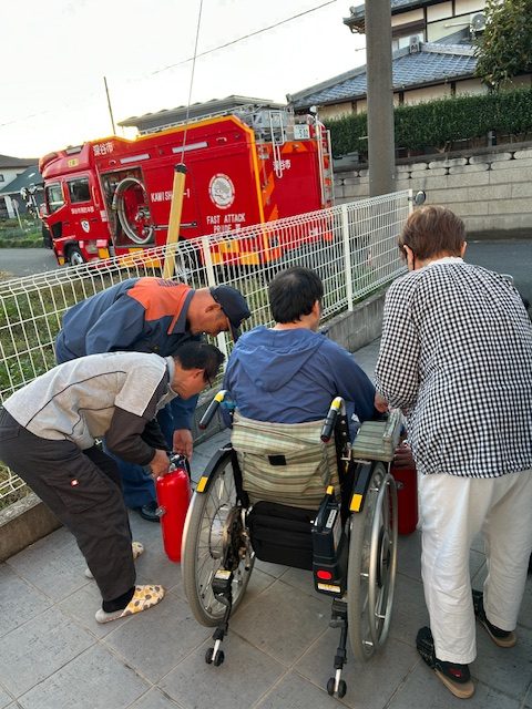 まずは消火器の使い方をご指導いただき、みなさんと一緒に行いました。