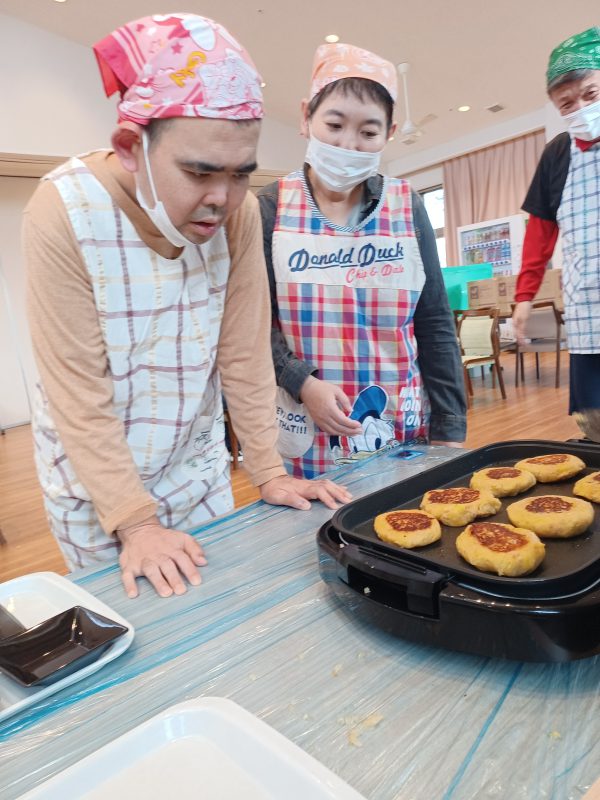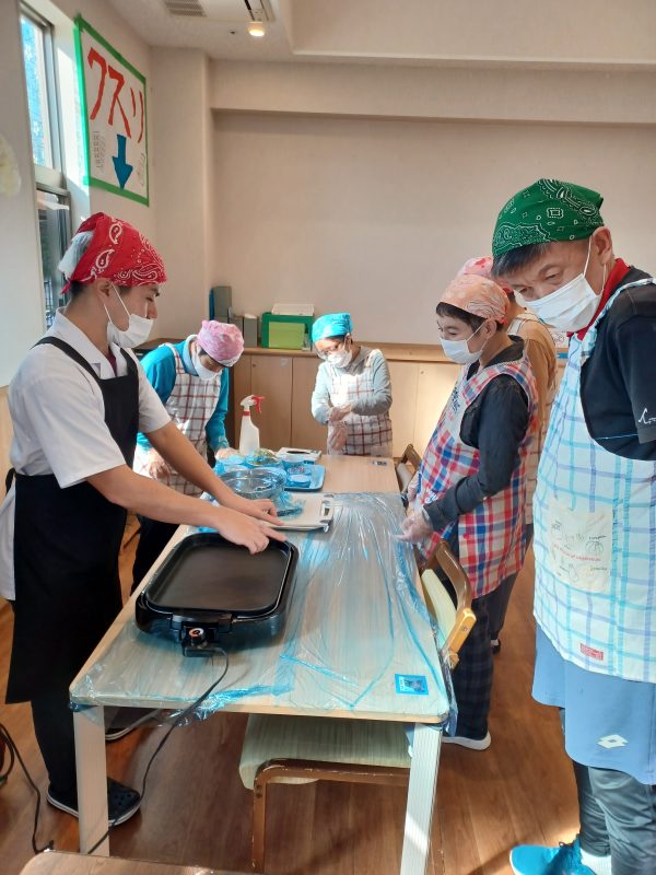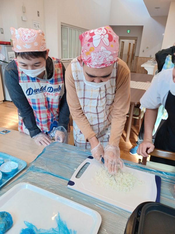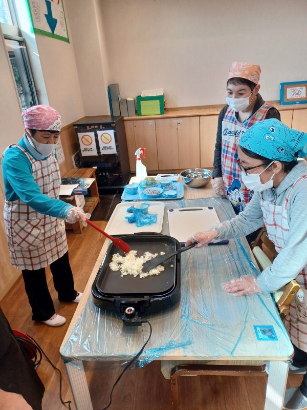 包丁とホットプレートを使用し、ご利用者の方が積極的に玉ねぎを切ってもらいましたが、玉ねぎが目にしみて時折涙を流す場面も見られました。
