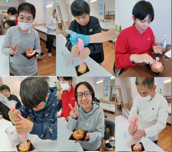 焼けたシューを冷ましピンクのホイップを入れて完成!!