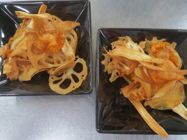 ごぼうやレンコン、ニンジン・さつまいもを素揚げしました。どの野菜も美味しくてサクサク・パリパリと召し上がっていました。