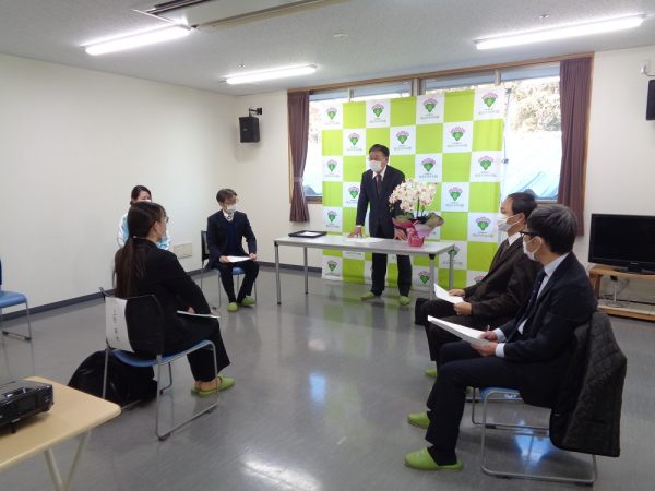内定式では、楳澤理事長より歓迎の言葉をいただきました。内定者は緊張しながらも真剣なまなざしで耳を傾けていました。