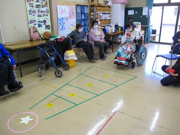 まずは景品を掛けた戦い!ボッチャのボールを使ってのクリスマスバージョンゲーム♪