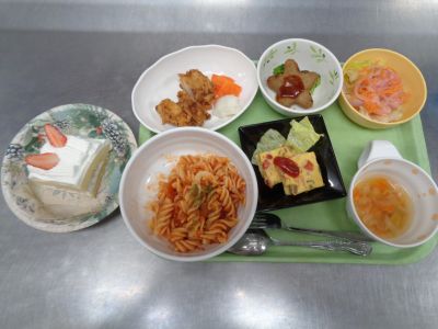 献立はクリスマスペンネ、フライドチキン、サラダ、スパニッシュオムレツ、星形のハンバーグ、