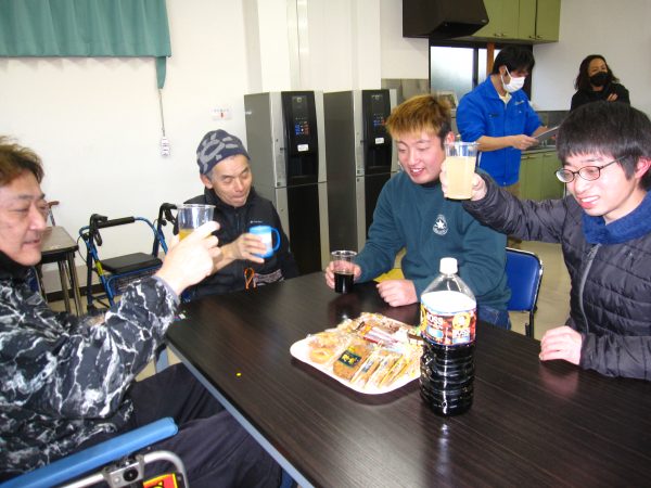 自治会長のあいさつで乾杯!たくさん用意した飲み物やお菓子を食べながら談笑。