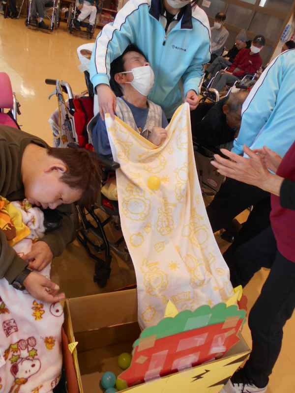 レクリエーションでは豆に見立てたボールを鬼は外!福は内!と力強くみんなで投げ心の鬼退治を行いました。
